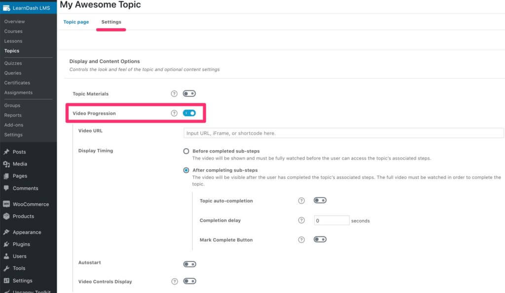 Questa impostazione determina quando il video sarà mostrato all’utente, e come gestire i passaggi secondari associati con la lezione/argomento.
