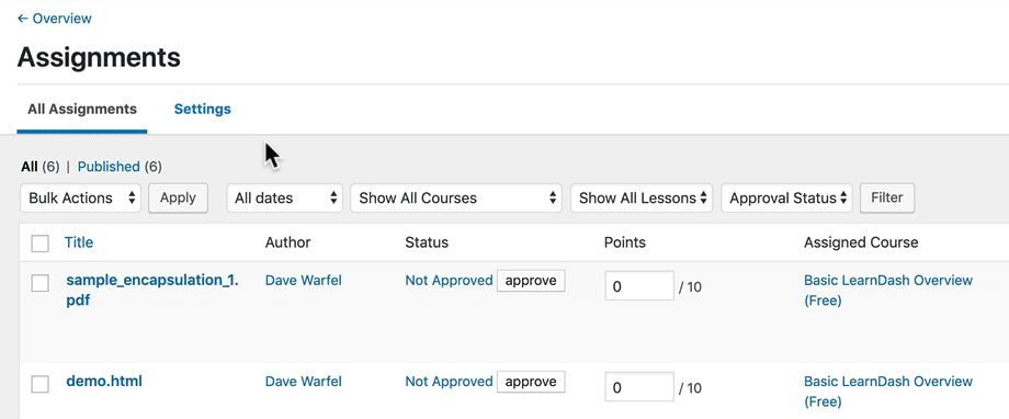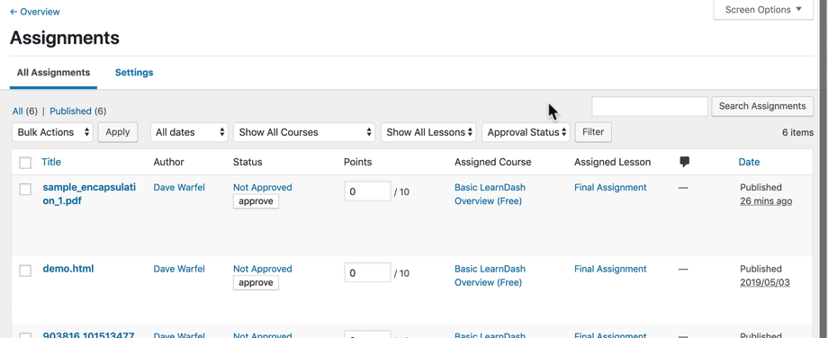 Puoi utilizzare più filtri contemporaneamente. Ad esempio, puoi filtrare in base ai compiti caricati: March 2019; Course A Not Approved.