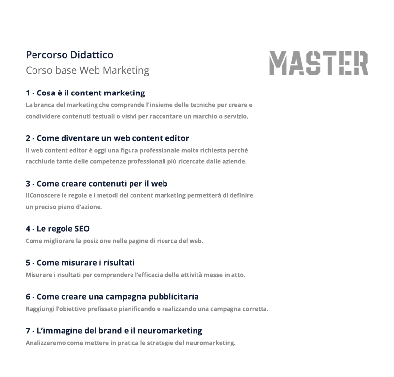 Nel modulo conclusivo vedremo anche le principali figure professionali oggi richieste dal mercato per il settore del web marketing e gli sbocchi lavorativi per ogni profilo.