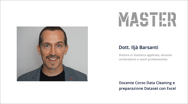 Una volta che i dati sono stati raccolti o reperiti non sono ancora pronti per essere analizzati. Infatti, devono essere puliti e sistemati secondo il principio del “garbage-in, garbage-out” (spazzatura in entrata, spazzatura in uscita), vale a dire che se i dati non sono preparati ad hoc conducono a distorsioni ed errate interpretazioni dei fenomeni reali. In breve tempo sarai in grado di padroneggiare gli strumenti che Excel mette a disposizione per la pulizia dei dati. Per farlo abbiamo scelto come docente l’esperto Iljà Barsanti, docente universitario e coach professionista.