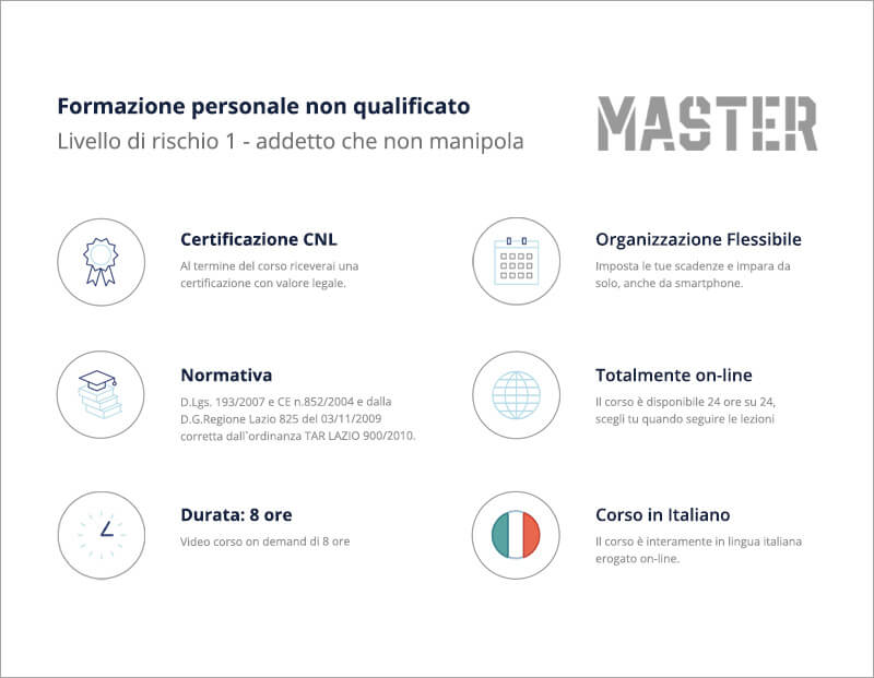 Tutto il personale impiegato nel settore alimentare, nell’industria, nella ristorazione e somministrazione, come ristoranti e bar, nel commercio e in ogni altro settore alimentare, ove NON è prevista la manipolazione degli alimenti, sono tenuti a seguire il Corso di formazione personale non qualificato livello di rischio 1 previsto dal sistema HACCP, così come indicato dalla legge vigente sulle norme igieniche.