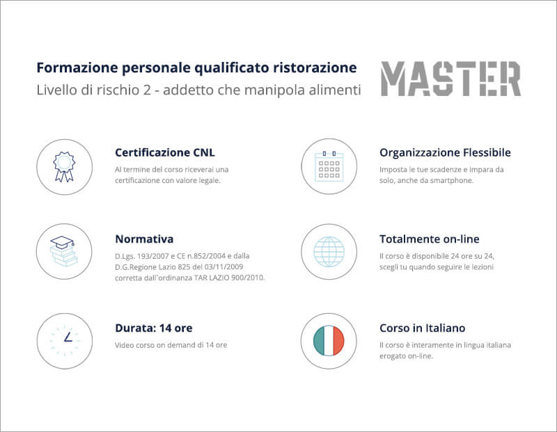 Tutto il personale impiegato nel settore alimentare, nell’industria, nella ristorazione e somministrazione, come ristoranti e bar, nel commercio e in ogni altro settore alimentare, ove è prevista la manipolazione degli alimenti, sono tenuti a seguire il Corso di formazione personale qualificato ristorazione livello di rischio 2 previsto dal sistema HACCP, così come indicato dalla legge vigente sulle norme igieniche.