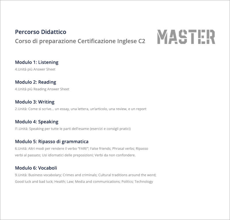 Il corso è strutturato in 6 moduli progressivi che ti accompagneranno nell’apprendimento di nozioni e metodologie utili all’esame di certificazione di inglese livello C2: