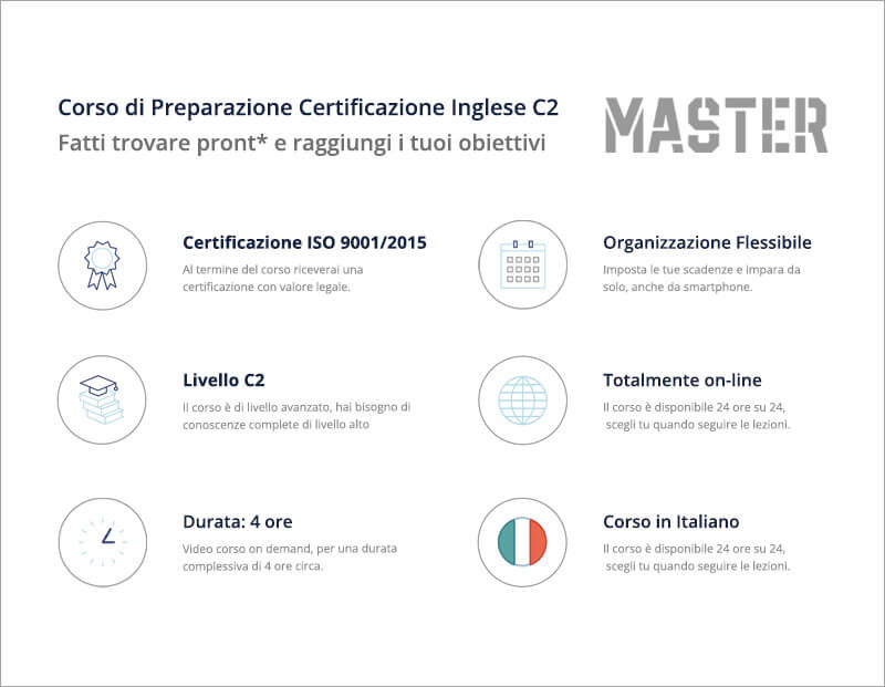Con il corso di preparazione per la certificazione d’inglese livello C2 superi tutti gli esami utili all’ottenimento del titolo riconosciuto a livello internazionale e dal MIUR. Ti offriamo una preparazione adeguata al livello richiesto a prescindere dall’ente straniero con cui deciderai di certificare la tua competenza linguistica.